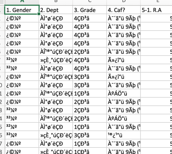 ๋๋ MacBook Pro๋ฅผ ์ฌ์ฉํ๋ค. RStudio์์ csvํ์ผ์ ์ฝ์ด ์์ผ ํ๋๋ฐ csvํ์ผ์ด ๊นจ์ง๋ ๊ฒฝ์ฐ๊ฐ ์๋ค. ๋ด ์๊ฐ์ ์ฒ์๋ถํฐ csvํ์ผ์ธ ๊ฒฝ์ฐ๋ ์๊ด์ด ์๋๋ฐ ๋ด ์ปดํจํฐ์์ Microsoft Excel ์ ์ฌ์ฉํ์ฌ csvํ์ผ๋ก ๋ณํ์ ํ๋ฉด ๊นจ์ง๋ ๊ฒ ๊ฐ๋ค.