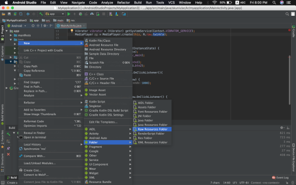 4. MediaPlayer์ ๋ค์ด ๊ฐ mp3ํ์ผ์ ๋ฃ๊ธฐ ์ํด resํด๋ ์์ rawํด๋๋ฅผ ์์ฑํ๋ค. ๊ทธ๋ฆฌ๊ณ ๊ทธ ์์ mp3ํ์ผ์ ๋ฃ๋๋ค.