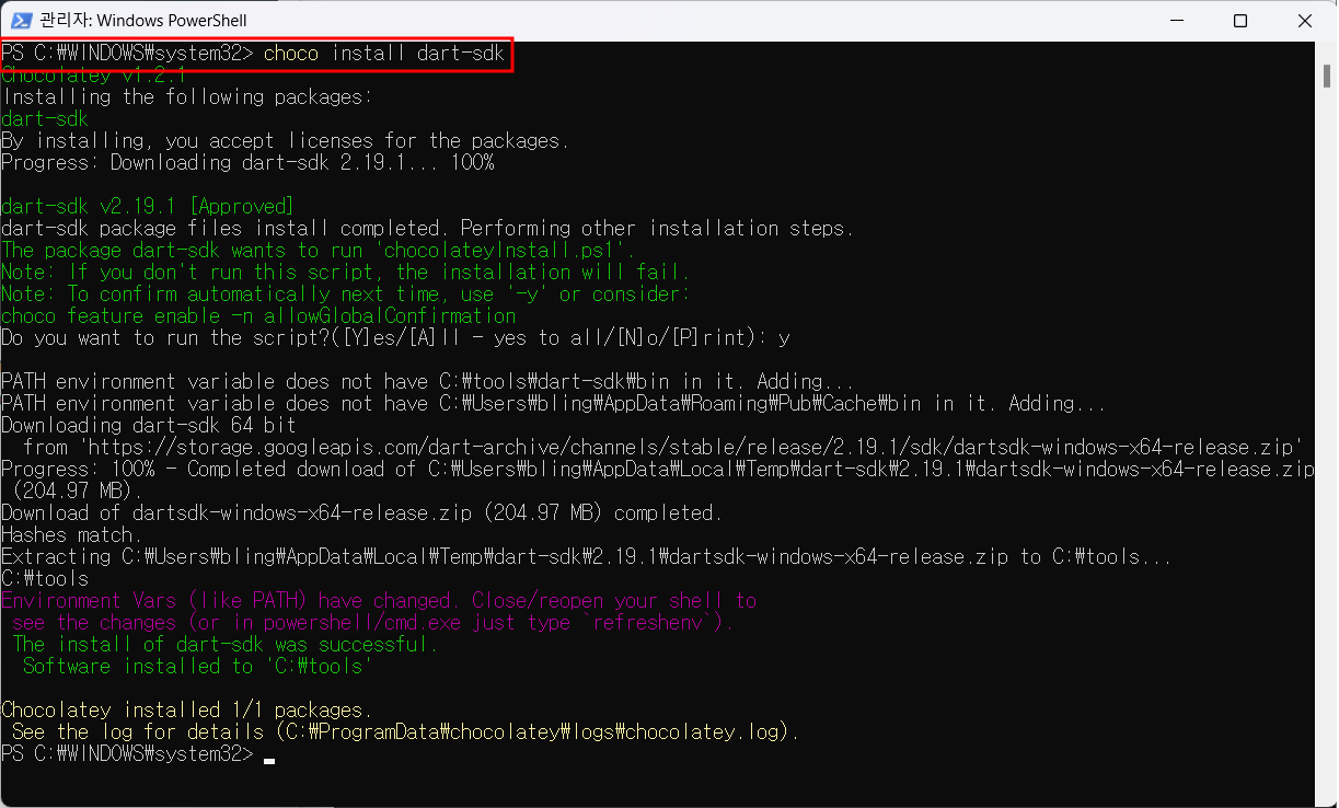 (Dart SDK λ₯Ό μ κ·Έλ μ΄λ νκΈ° μν΄μλ, choco upgrade dart-sdk μ€ν)