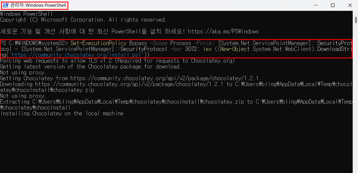 | > Set-ExecutionPolicy Bypass -Scope Process -Force; [System.Net.ServicePointManager]::SecurityProtocol = [System.Net.ServicePointManager]::SecurityProtocol -bor 3072; iex ((New-Object System.Net.WebClient).DownloadString('https://community.chocolatey.org/install.ps1')) |