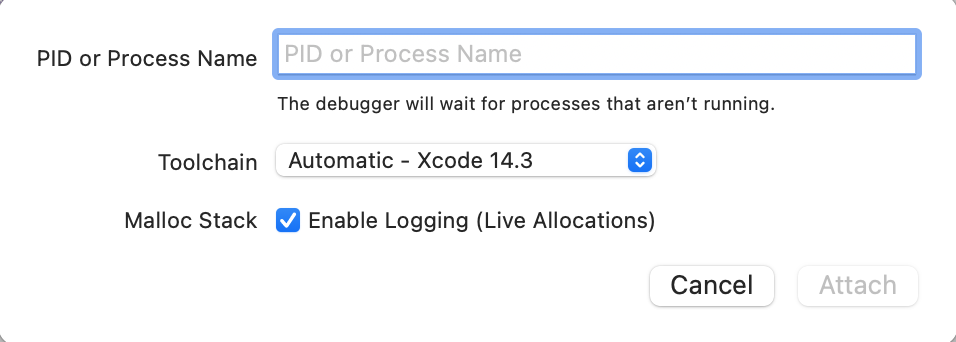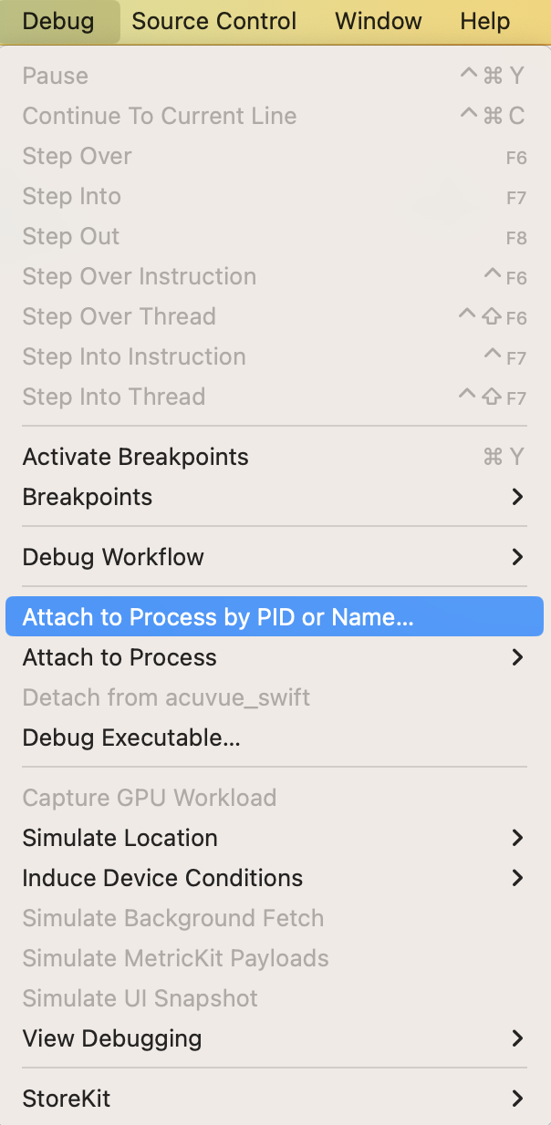 1. ํด๋ํฐ ๋จ๋ง๊ธฐ๋ฅผ ์ฐ๊ฒฐํ ์ํ๋ก Debug > Attach to Process by PID or Name…
