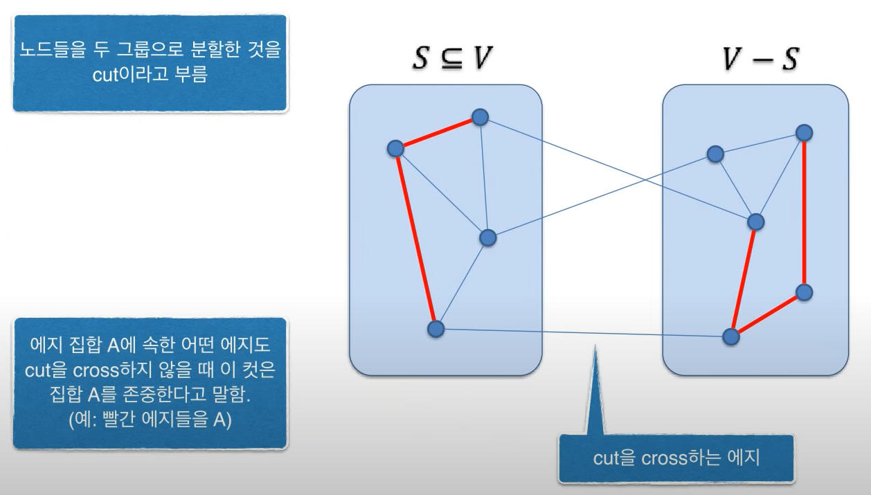 - ์์ง๋ค์ ๋ถ๋ถ์งํฉ A์ ์ํ ์ด๋ค ์์ง๋ ์ปท (S, V-S)๋ฅผ crossํ์ง ์์ ๋, ์ปท(S, V-S)๋ A๋ฅผ ์กด์คํ๋ค(respect)๊ณ ๋งํ๋ค.