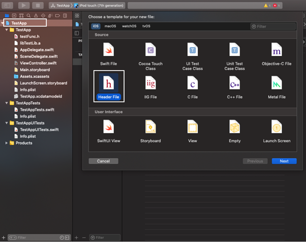 26) TestApp > ์ฐํด๋ฆญ > New File > Header File