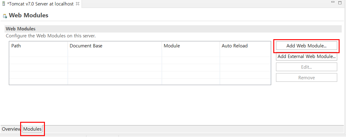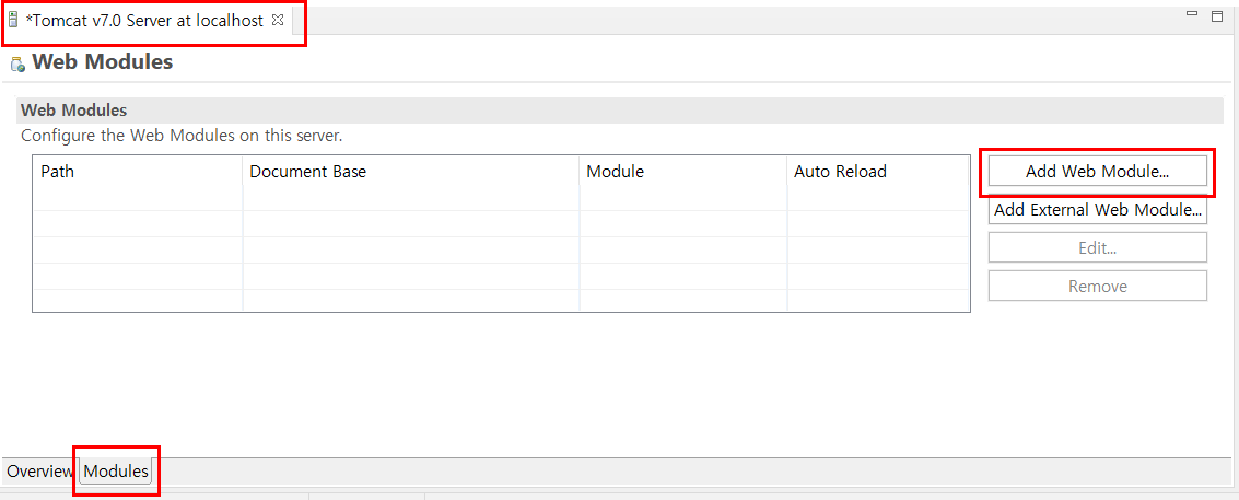 4. Tomcat Server์ ๋๋ธํด๋ฆญํ๋ฉด ๊ฐ์ฅ ๋จผ์ ๋จ๋ ํ์ด์ง๋ Overview์ธ๋ฐ, ์ด๋ ๋ฌด์