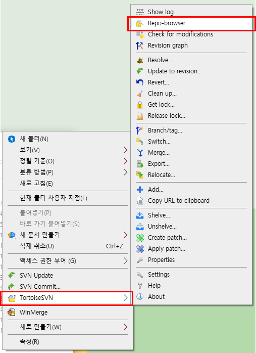 1. ๋ง์ฐ์ค ์ฐํด๋ฆญ > TortoiseSVN > Repo-browser