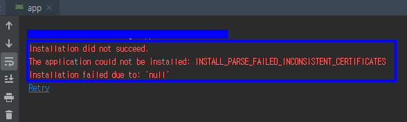 ๋ฌธ์ ์ํฉ : ์ํ ์ฑ ์ค์น ์ค์ "INSTALL_PARSE_FAILED_INCONSISTENT_CERTIFICATES" ์๋ฌ๊ฐ ๋ฐ์ํ ๊ฒฝ์ฐ