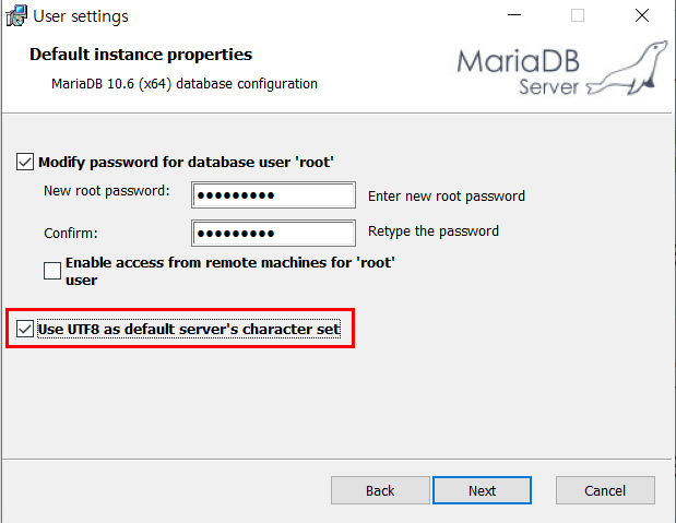 4.4. ์ฌ์ฉํ ๋น๋ฐ๋ฒํธ ์ ๋ ฅ ํ 'Use UTF8 as default server's character set' ์ฒดํฌ > Next