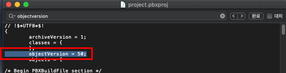 3. objectVersion = 50; -> objectVersion = 48; ๋ก ์์