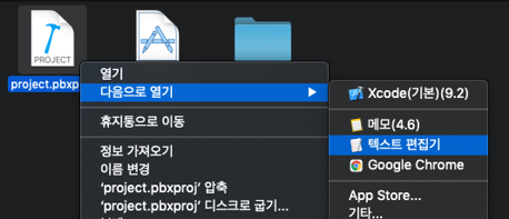 2. project.pbxproj ์ฐํด๋ฆญ > ๋ค์์ผ๋ก ์ด๊ธฐ > ํ ์คํธ ํธ์ง๊ธฐ