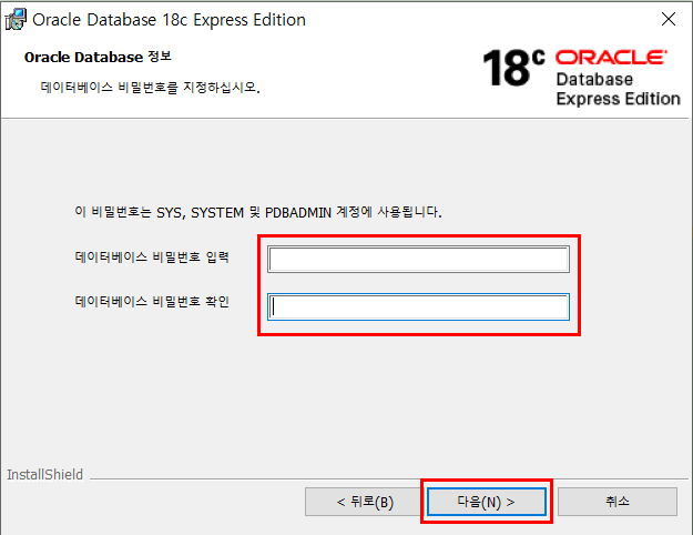 4. SYS, SYSTEM, PDBADMIN ๋ฐ์ดํฐ๋ฒ ์ด์ค์ ๋น๋ฐ๋ฒํธ๋ฅผ ์ ํด์ค๋ค. ์์ง ์๋๋ก ์ฌ์ด ๋น๋ฐ๋ฒํธ๋ก ์ ํด์ฃผ์. > ๋ค์(N)