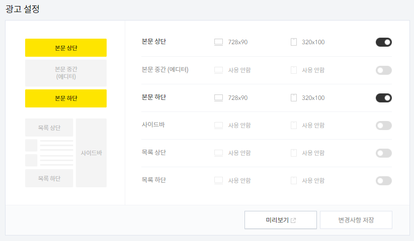 5. ๋ค์ ๋ธ๋ก๊ทธ ๊ด๋ฆฌ ํ์ด์ง๋ก ๋์ ์, ์์ต > ์ ๋ํ ๊ด๋ฆฌ ํ์ด์ง๋ฅผ F5 ๋๋ฌ ์๋ก๊ณ ์นจํ๋ฉด. ๊ด๊ณ ์ค์ ์น์ ์ด ์ด์๋ ๊ฒ์ ํ์ธํ ์ ์๋ค!