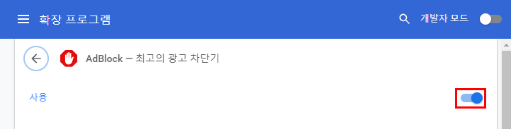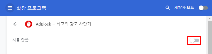 4. ํ์ฅ ํ๋ก๊ทธ๋จ ํ์ด์ง๋ก ์ด๋ํ๋ฉด AdBlock ์ฌ์ฉ์ ๋นํ์ฑํ ํ๋ค.